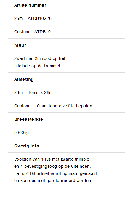Alltracks dubbel gevlochten liertouw is beschikbaar in verschillende afmetingen. De levertijd voor touwen op maat is circa 8 weken. Omdat deze op maat gemaakt worden, kunnen deze niet geretouneerd worden.