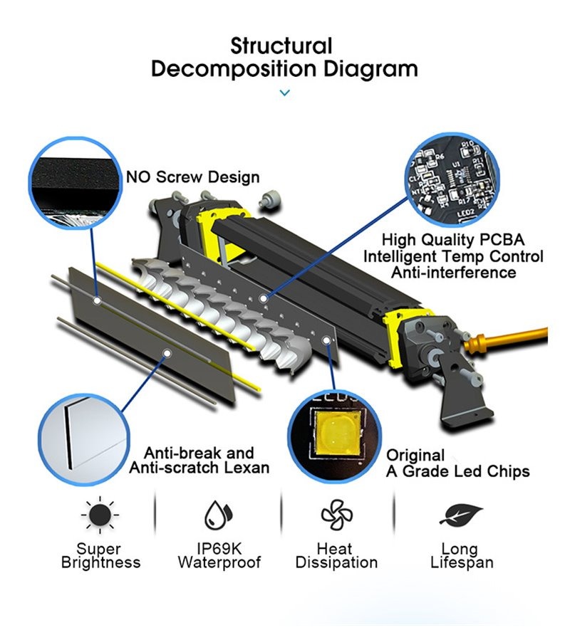 Ledbar wordt geleverd met waterdichte Deutsch DT connector + een kabelset met schakelaar, relais en zekering waardoor de ledbar eenvoudig aan te sluiten is.
