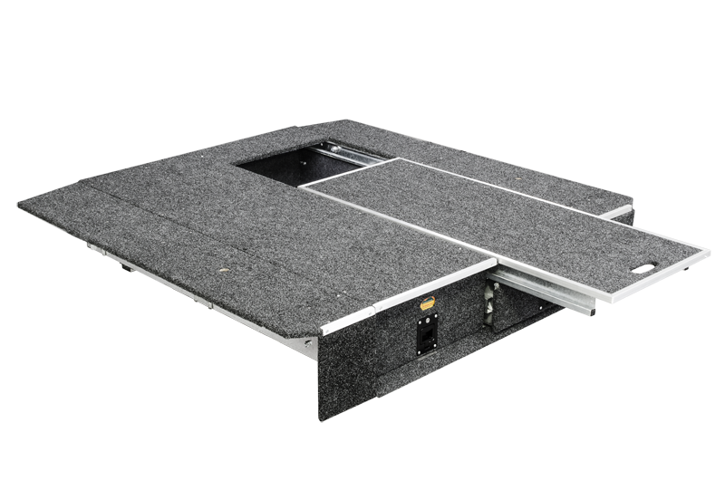 Het ladekastsysteem is aan bovenzijde over de gehele breedte en lengte van de laadbak vlak afgewerkt, waardoor u een strakke, optimaal te benutten laadruimte heeft. U heeft hierbij geen verlies door de wielkasten, omdat de ontstane ruimtes voorzien zijn van uitneembare panelen aan bovenzijde. In deze ruimtes kunt u bijvoorbeeld vaste accesoires als een compressor, omvormer of boordaccu kwijt, of bijvoorbeeld losse spullen die u minder vaak nodig heeft. Bij de Extra cab zit er aan voorzijde in de laadbak een extra ruimte met uitneembaar panelen, vanwege de langere laadbaklengte.