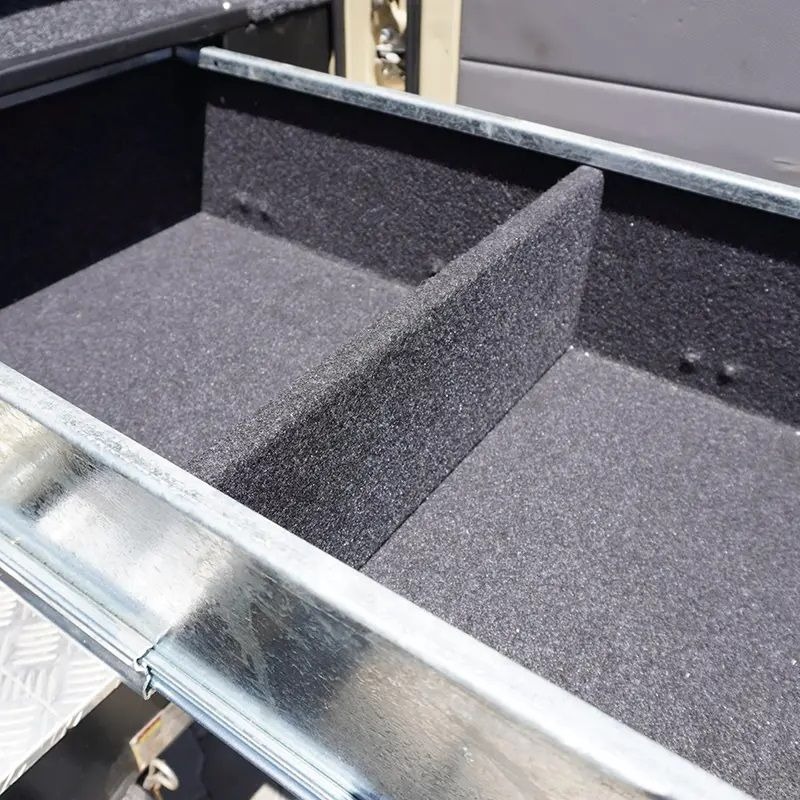 De lades lopen op afgedichte rollagers en kunnen maar liefst 80 kg per lade dragen. De lades zijn aan de binnenzijde en bovenzijde voorzien van tapijt.