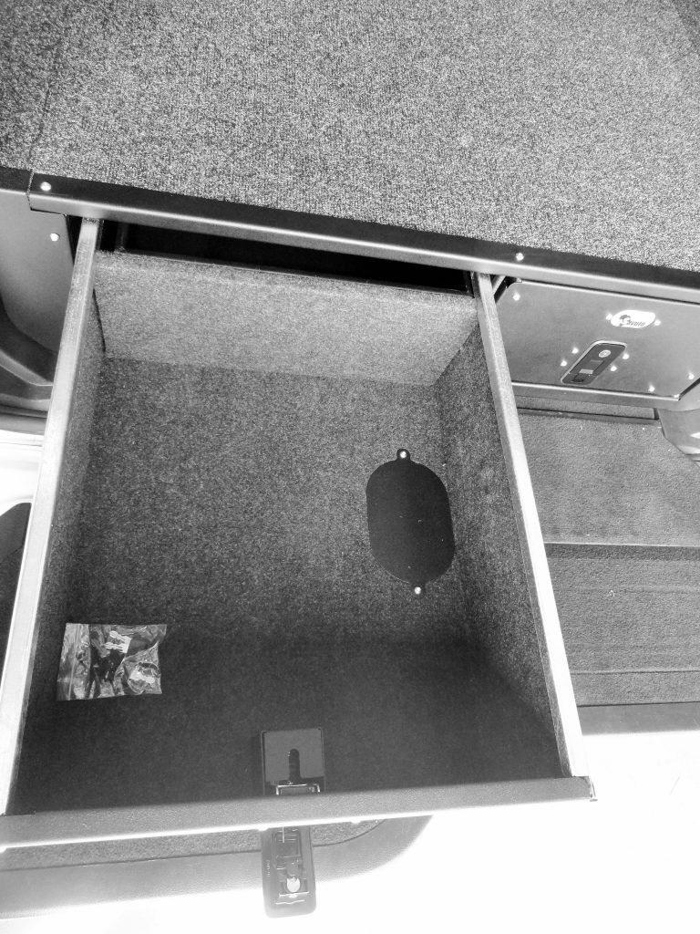 De lades lopen op afgedichte rollagers en kunnen maar liefst 80 kg per lade dragen. De lades zijn aan de binnenzijde en bovenzijde voorzien van tapijt.