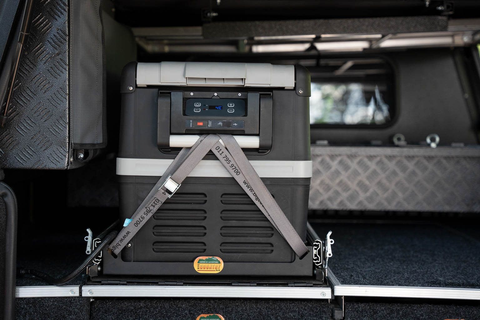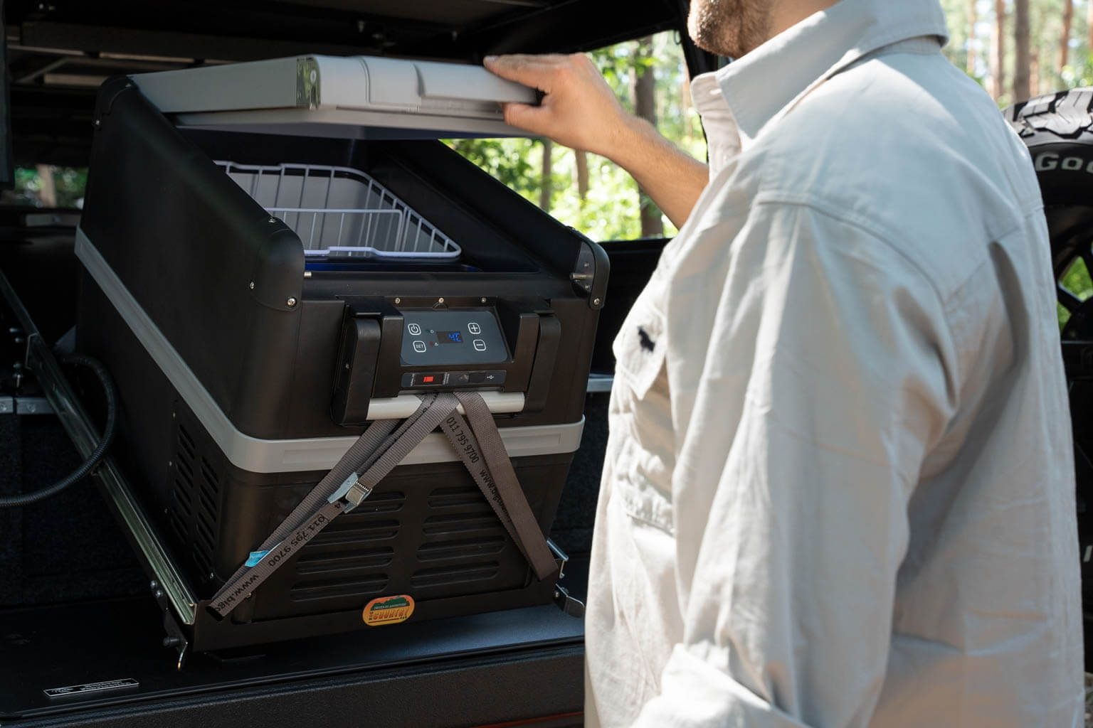 De levering omvat tevens bevestigingsmaterialen voor montage op bijvoorbeeld een ladesysteem en een spanbandenset om de koelkast aan de slider te bevestigen.