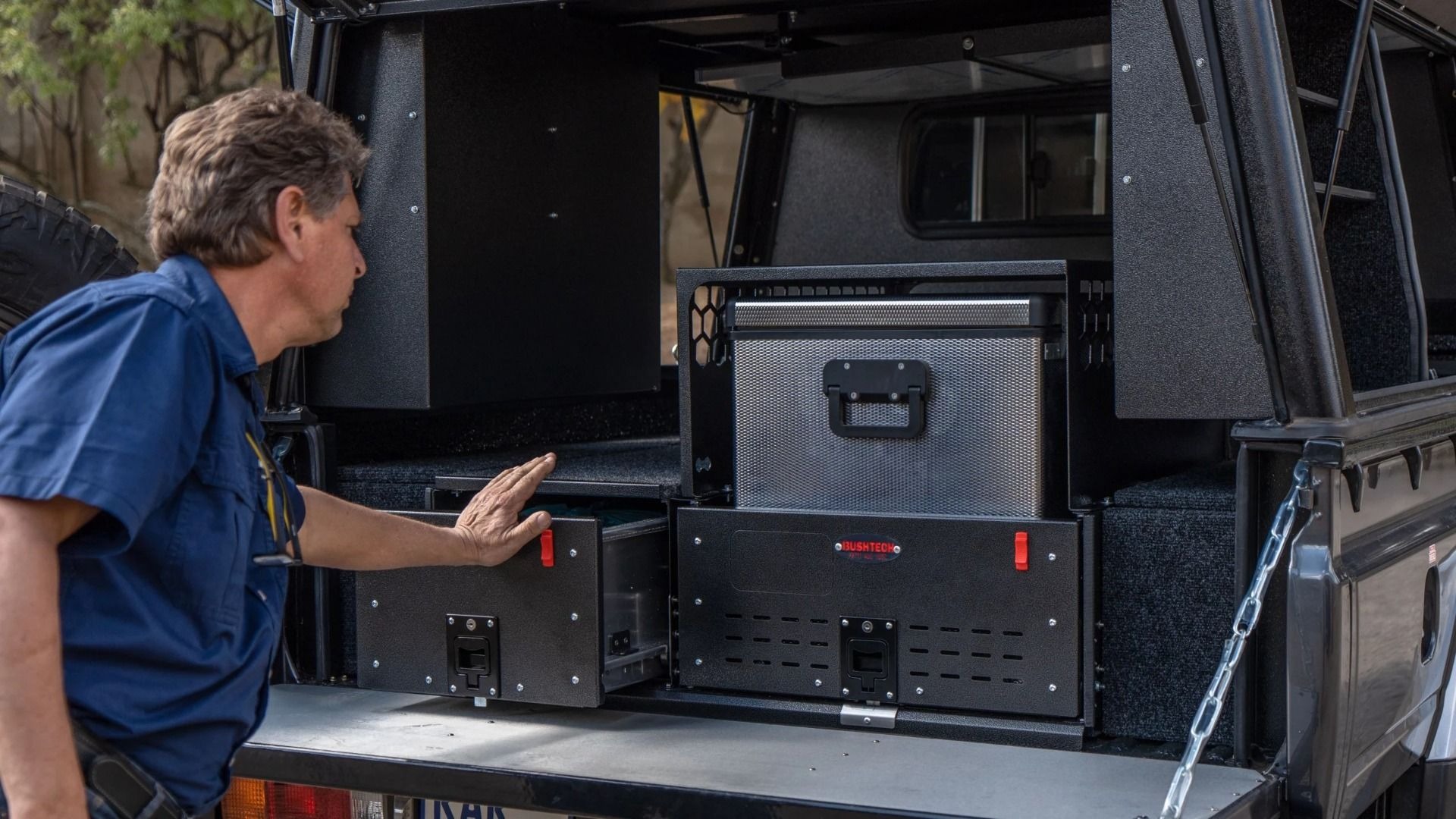 Dit betreft een van de enige ladekasten op de markt waarbij het mogelijk is de koelkast in de lade te plaatsen. De koelkast lade kan optioneel worden uitgerust met een kabelrups zodat de stroomkabels niet beschadigd raken wanneer de lade in en uit wordt geschoven. In samenwerking met koelkast fabrikanten heeft Bushtech voldoende ruimte en uitsparingen in de lade geplaatste voor de ventilatie van de koelkast. Het unieke modulaire systeem maak het mogelijk een plaat op de koelkastlade te plaatsen wanneer de koelkast verwijderd is, waardoor een compleet vlakke laadvloer (false floor) ontstaat.