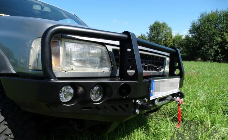 Voorbumper met plaat voor lier en bullbar, speciaal voor OPEL FRONTERA A 91-98. De hoofdconstructie van de bumper is gemaakt van 3 mm dik plaatstaal en de plaat voor de lier en bevestigingen aan het frame van 5 mm dik plaatstaal. Het product wordt eerst met laser gesneden, vervolgens gebogen op een CNC-afkantpers en de juiste vorm wordt verkregen door handmatige afwerking. De volgende fase is corrosiebescherming bestaande uit de positie van een zinkpoederprimer en poedercoating die de bumper een laatste look geeft.