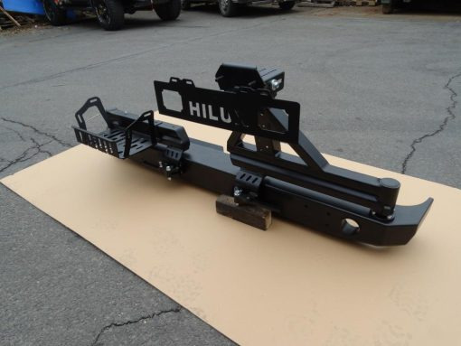 De bumper heeft bevestigingsgaten voor beugelhandvatten, twee gaten voor de hi-lif-krik en gaten voor lampen ter vervanging van lampen die in de originele bumper zijn ingebouwd.