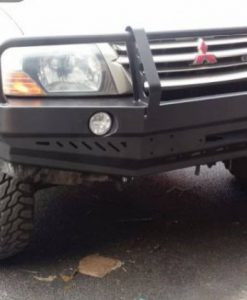 Voorbumper met lierplaat en bullbar, speciaal voor de auto MITSUBISHI PAJERO III 99-06. De hoofdstructuur van de bumper is gemaakt van 3 mm dik plaatstaal en de lierplaat en de framebevestigingen zijn gemaakt van 5 mm dik plaatstaal. Het product wordt eerst met een laser gesneden, vervolgens gebogen op een CNC-afkantpers en de juiste vorm wordt verkregen tijdens handmatige afwerking.