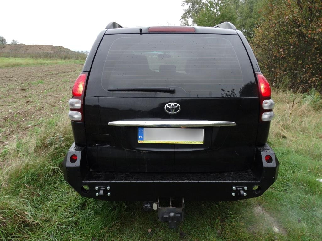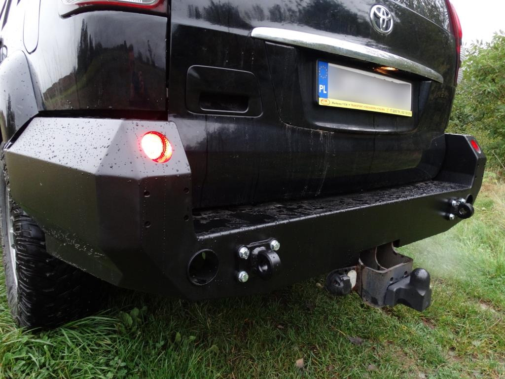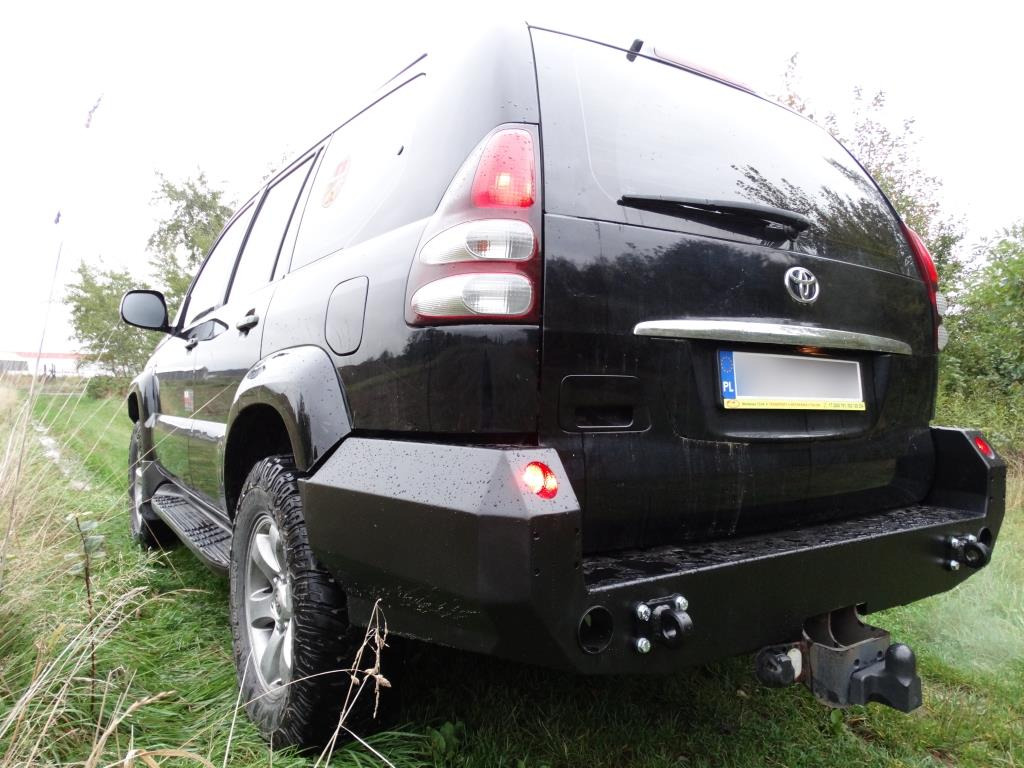Achterbumper, speciaal voor TOYOTA LAND CRUISER 120 Serie . De structuur van de bumper is gemaakt van 4 mm dik staal en de bevestigingen aan het frame zijn 5 mm dik . Het product wordt eerst met een laser gesneden, vervolgens gebogen op een CNC-afkantpers en tijdens handmatige afwerking wordt de juiste vorm verkregen . De volgende fase is de anticorrosiebescherming , bestaande uit het aanbrengen van een zinkpoederprimer en poedercoating die de bumper zijn uiteindelijke uiterlijk geeft.