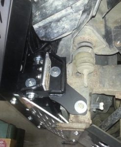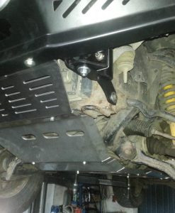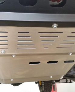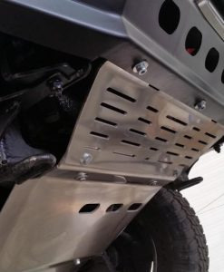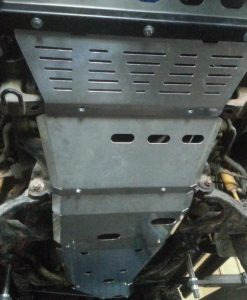 Skidplate set voor de motor, versnellingsbak en tussenbak voor de TOYOTA LANDCRUISER 125 SERIE , gemaakt van 6 mm dik aluminium . Het product wordt eerst met een laser gesneden, vervolgens op een kantpers gebogen en tijdens handmatige afwerking wordt de juiste vorm verkregen . De hoes beschermt het verloopstuk tijdens het off-road rijden.