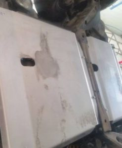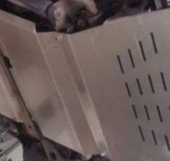 Transmissie- en reductiekap speciaal voor MITSUBISHI PAJERO III 99-06, gemaakt van 6 mm dik aluminium. Het product wordt eerst met een laser gesneden, vervolgens op een kantbank gebogen en de juiste vorm wordt verkregen door handmatige afwerking. Een afdekking beschermt de versnellingsbak en het voertuigreductiemiddel van onderaf bij off-road rijden.