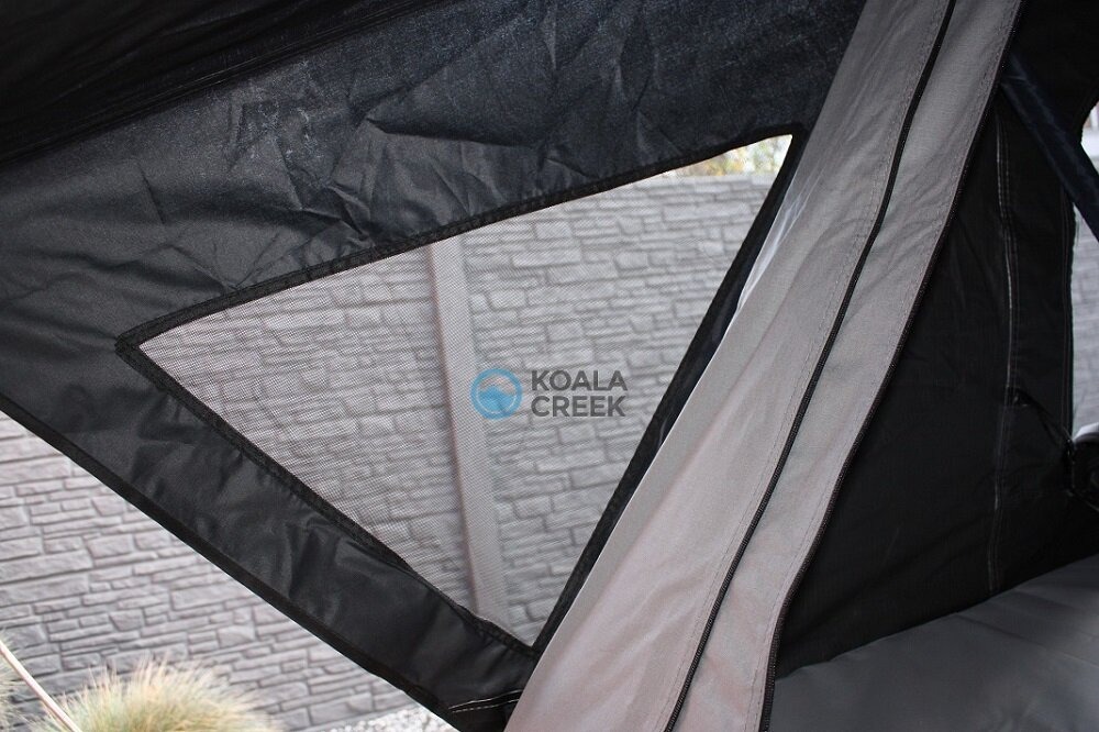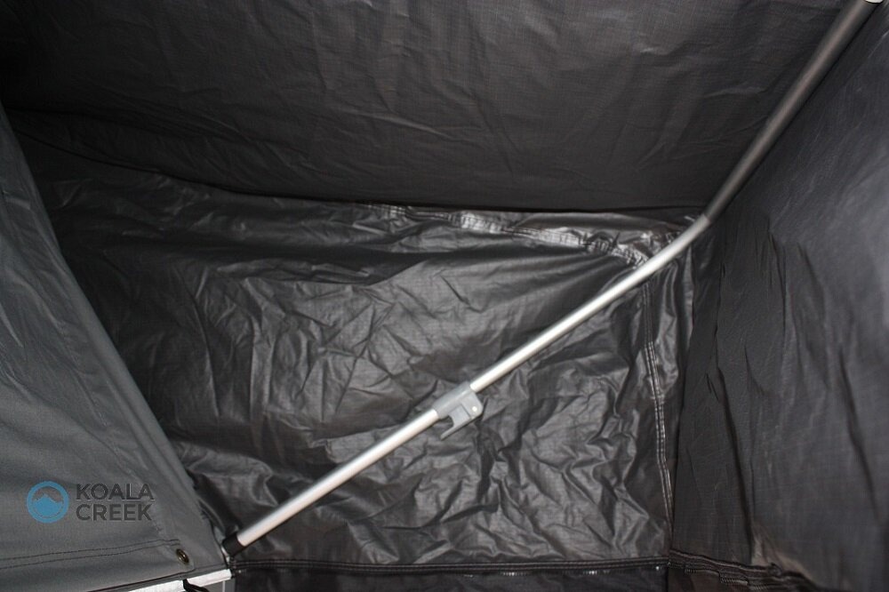 - Uniek is het donkergrijze doek met FRID coating: Flame Retardant Inside Dark coating. Heel veilig en extreem donker in de daktent.