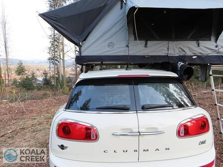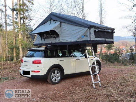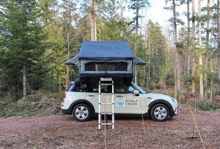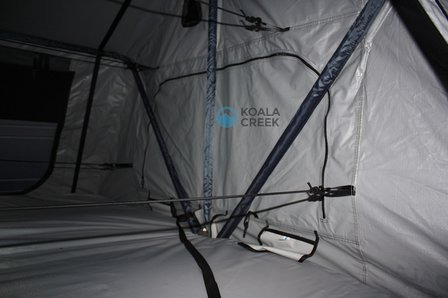 Bij deze Koala Creek® Teide L pak je de verstelbare U-beugel onder de bodem uit en monteert deze met de verstelbare nokspanstang in de overdekte instap. Stap de ladder op. Rol de deur en het gaas erachter op en zet ze vast. Nu kun je de daktent ingaan en je verwijdert de 4 elastieken. Deze steek je in een van de 4 handige opbergzakjes. Tip: Bovenop de ingeklapte daktent is links en rechts naaste de ladder (onder de cover) veel ruimte om onder meer je slaapzak en kussen (in een zak) op te bergen.