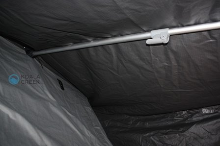 - Uniek is het donkergrijze doek met FRID coating: Flame Retardant Inside Dark coating. Heel veilig en extreem donker in de daktent.