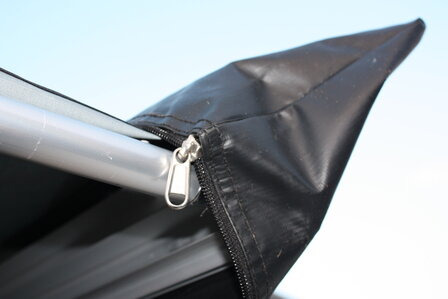 - Om de luifel zit een zwarte hoes van 680 gram/m2 water en stofdicht PVC, afsluitbaar met een YKK rits.