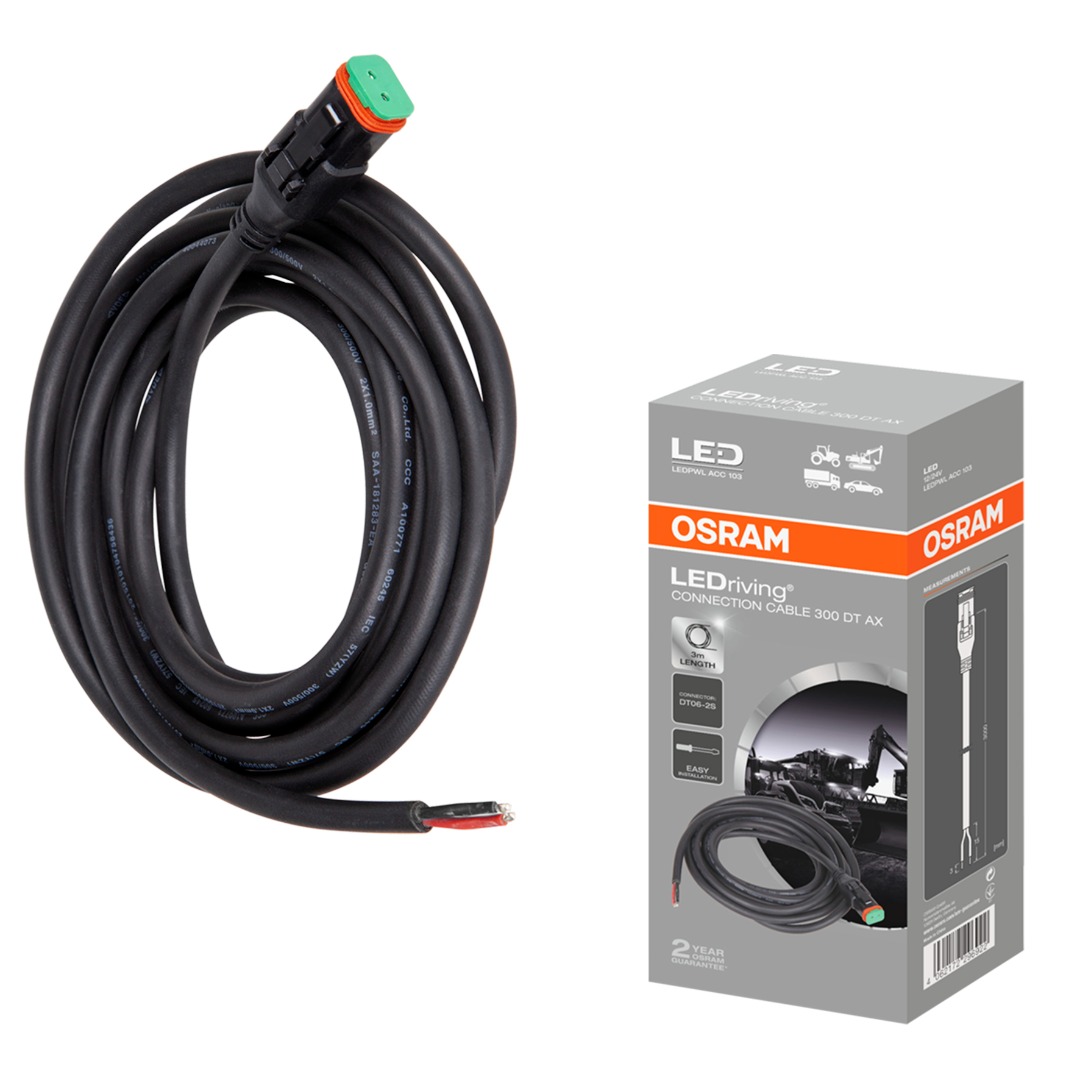 De LEDriving-verbindingskabel 300 DT AX is compatibel met alle OSRAM LEDriving-werklampen van de Professional-serie PX en met de LEDriving-rij- en werklampen van de SX- en FX-serie. Hij is geschikt voor 12V- en 24V-voertuigen en met de DT-connector kan hij een snelle en gemakkelijke aansluiting op een stroombron bieden voor het instellen van de LEDriving rij- en werklampen. Het geleidermateriaal is gemaakt van puur koper en met een lengte van 3 meter kan de kabel ook op grote voertuigen passende verlichting installeren.