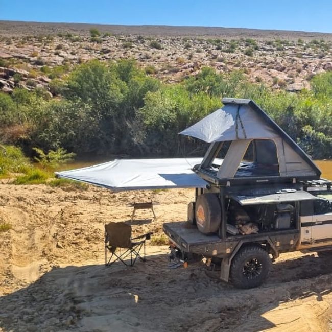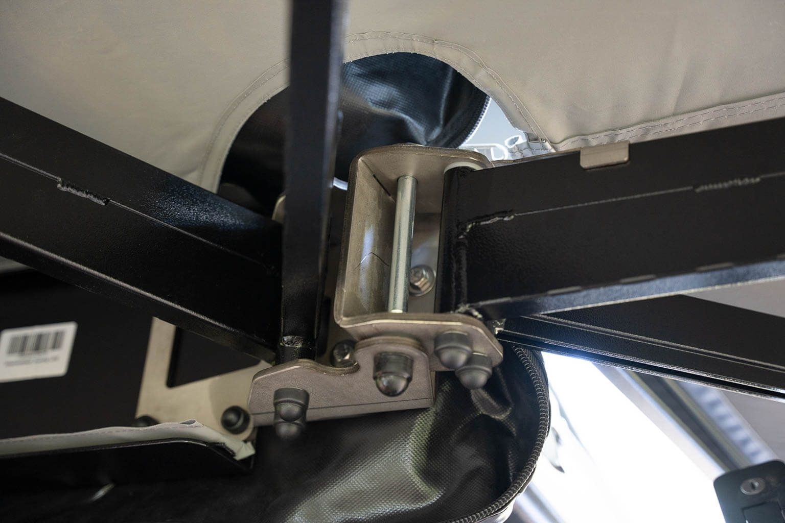 De luifel is in ingeklapte toestand opgeborgen in een aluminium box met een extra hoek aan de voorkant. De extra hoek beschermt het canvas tegen de armen die, bij offroad rijden, kunnen bewegen en hierdoor door het canvas zouden kunnen schuren.