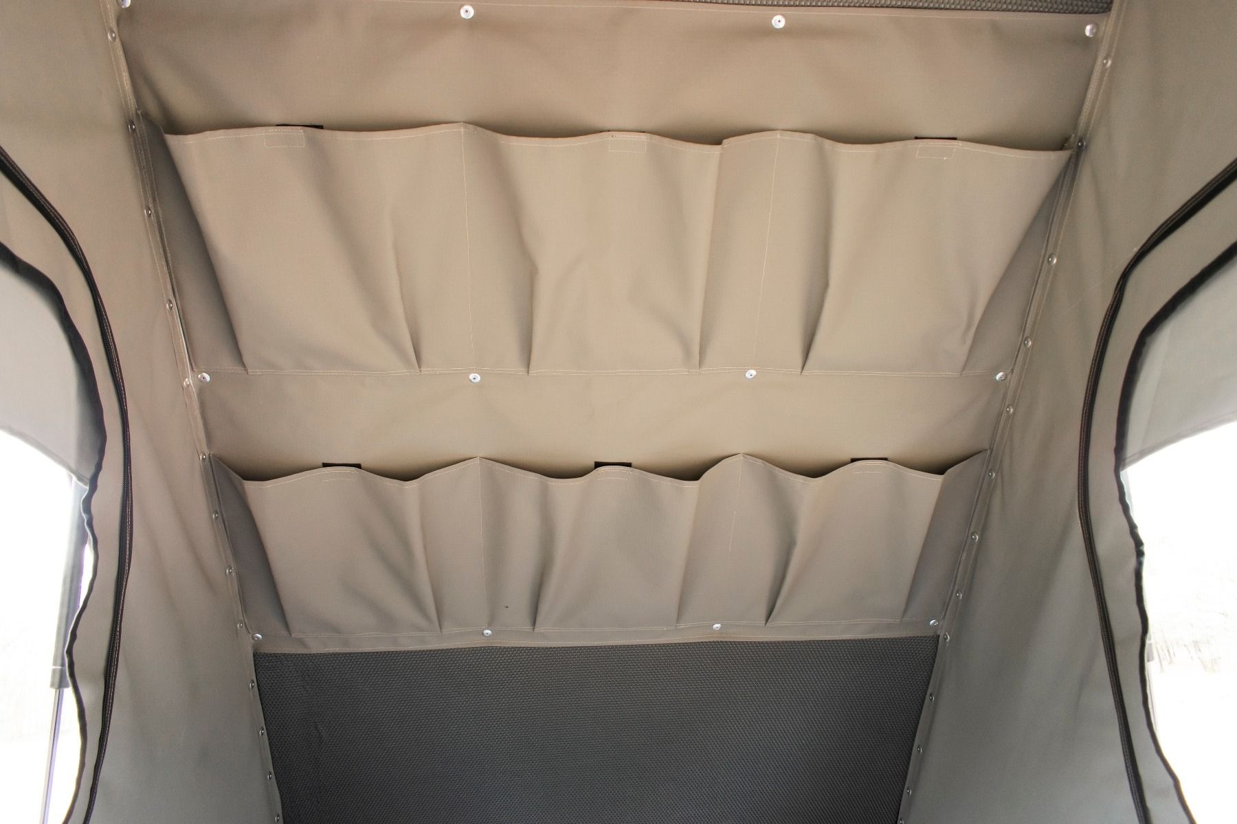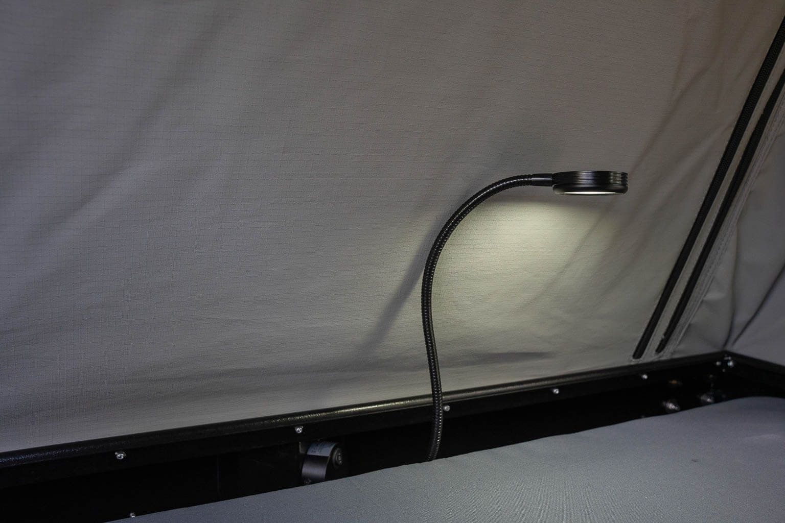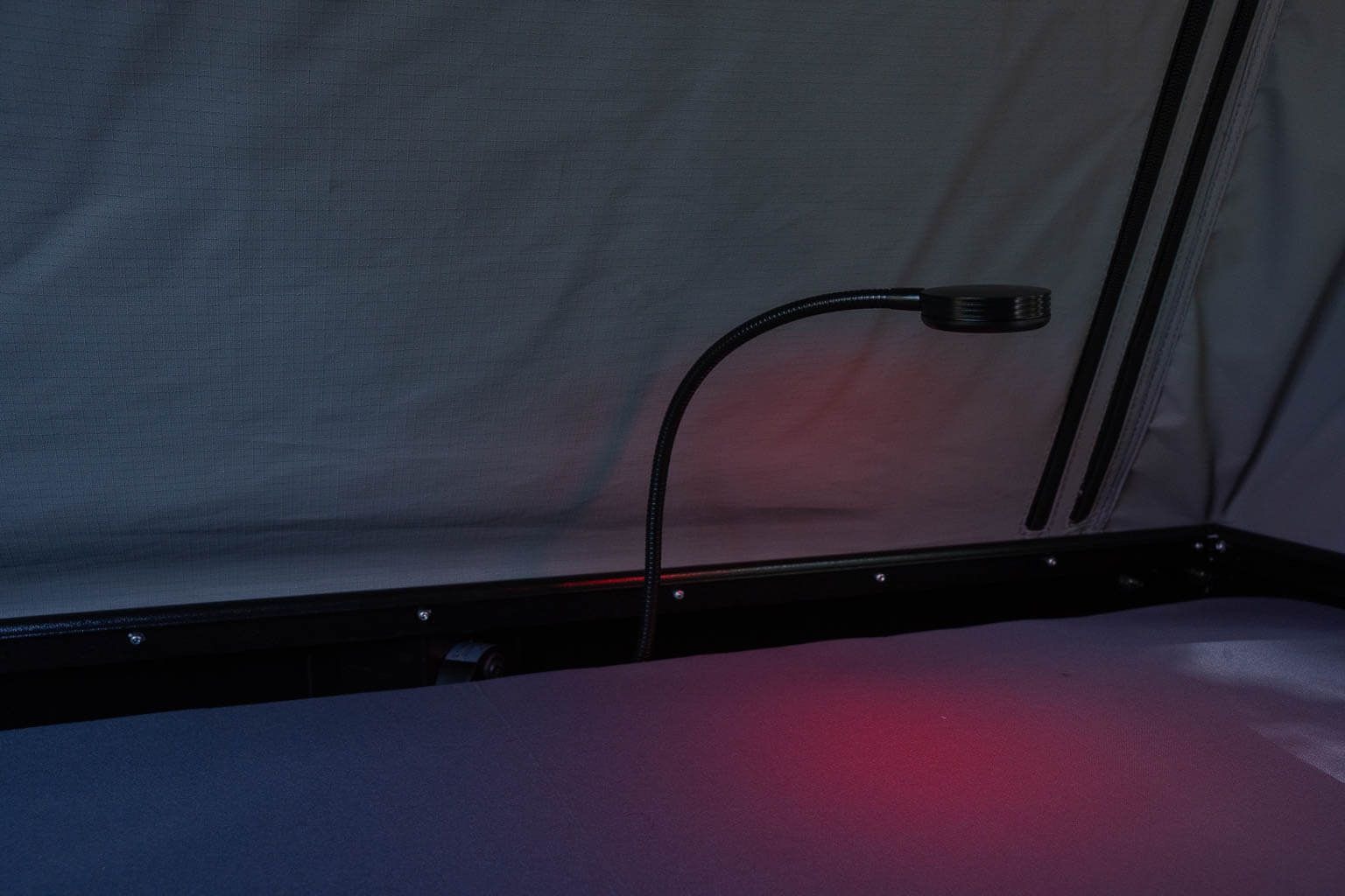 De daktent is voorzien van een 12V stopcontact, 2 USB-poorten en een LED-lamp met zowel wit als rood licht. Dat laatste is handig in gebieden waar veel muggen zitten aangezien zij niet op rood licht afkomen. Ondanks dat alle ingangen van de daktent uitgerust zijn met muggennet wilt u niet onnodig muggen aantrekken. Ook zijn in de daktent opbergruimtes aanwezig voor bijvoorbeeld uw kleding, ipad of boek.