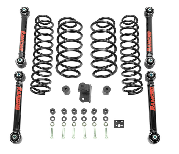 Rancho +2,5" (6cm) lift kit SPORT SYSTEM includes: 4 coils, 4 adjustable training arms, gearbox spacers kit, bump stop relocation kit, rear panhard relocation bracket. (Shocks not included).
