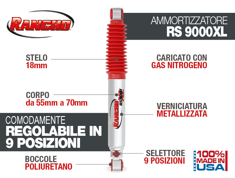 The adjustability of the Rancho® RS9000XL™ offers the performance of nine shock absorbers in one very flexible package. The Rancho® MyRide™ tuning technology provides you the ability to select nine different levels of performance or ride quality - quickly adapting to any driving condition. Built with a massive shock body, the RS9000XL™ shock delivers both performance and appearance to your truck and SUV.