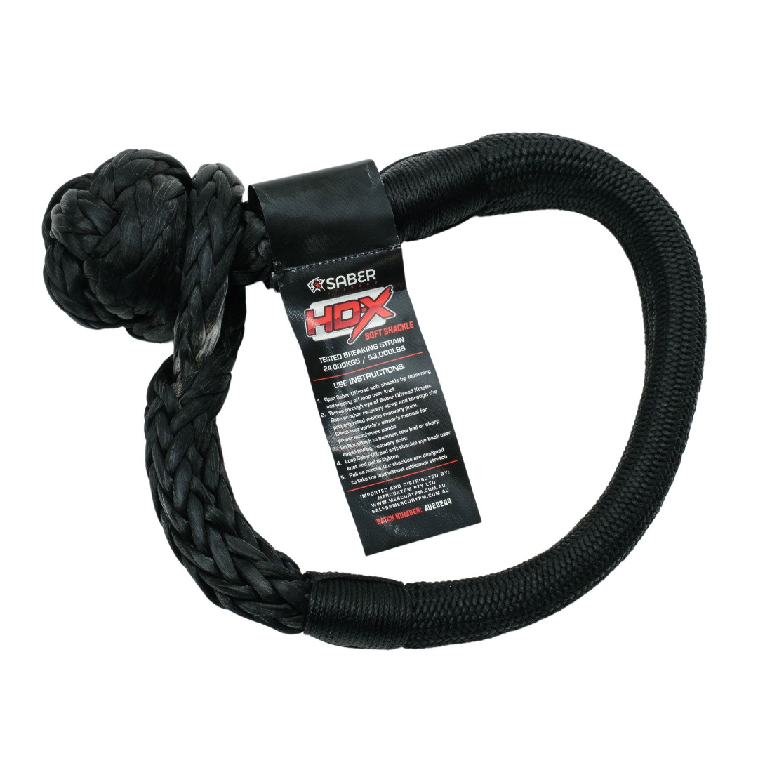 The HDX Technora Bound Soft Shackle by Saber Offroad uses proprietary SaberPro fibre combined with robust Technora binding to enhance cut resistance and overall durability. It is significantly stronger than previous models while remaining only slightly larger in diameter, making it suitable for 4×4 vehicles, towing, light-medium commercial vehicles, and certain military, agricultural, and mining uses.