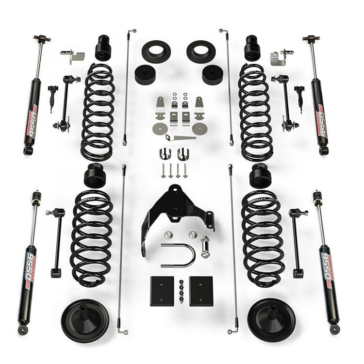 The TeraFlex JK 2dr: 4" Coil Spring Base Lift Kit includes just the basic lift components only and doesn–t have the drivability of a full suspension system. Requires adjustable control arms and adjustable front track bar to correct suspension geometry. An adjustable rear track bar is recommended. We recommend Falcon Performance Shocks or TeraFlex 9550 VSS Shocks. These are the only shock absorbers engineered to work with TeraFlex lift coil springs to improve both compression and rebound for optimal vehicle stability. Coil Spring Base Lift Kits are offered with TeraFlex 9550 VSS Twin-Tube Shocks or without shock absorbers. Falcon Performance Shocks are available separately.