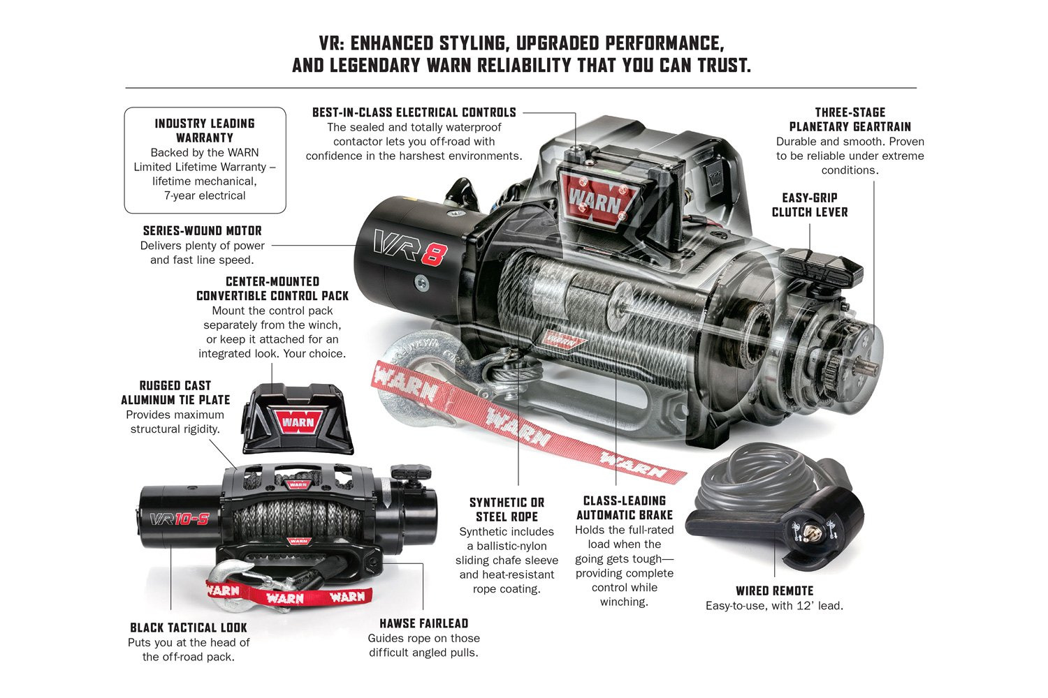 Ideaal voor grotere pickups, 4x4 voertuigen en SUV's die zwaar lierwerk vereisen De VR EVO 12S beschikt over beschermingsklasse IP68 waterdichte constructie, ultrabetrouwbare Albright®-contactor en verplaatsbare lierbedieningskast en een geavanceerde twee-in-één afstandsbediening voor extra gebruiksgemak en veelzijdigheid. Met zijn hoge lijnsnelheid en laag stroomverbruik behoort de VR EVO-serie treklieren tot de beste standaard-duty lierenserie die Warn ooit heft gemaakt. De VR EVO-serie is scherp geprijsd en heeft een doordacht ontwerp die er ook nog eens goed uitziet.