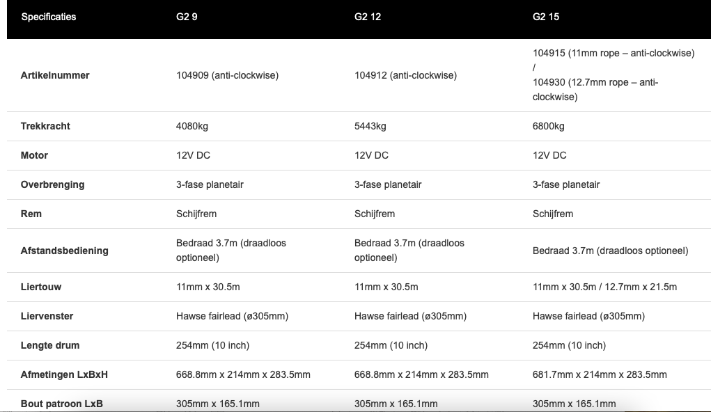 De geheel nieuwe serie G2 DC elektrische lieren zijn ideaal voor eerstehulpverleners, bedrijfsvoertuigen en andere toepassingen waar een elektrische lier de voorkeur heeft. Nieuwe prestatieniveaus, duurzaamheid en efficiëntie helpen om de klussen keer op keer snel en betrouwbaar te klaren. Deze serie is naast 12V ook in 24V verkrijgbaar en ook is er een hydraulische variant op de markt.